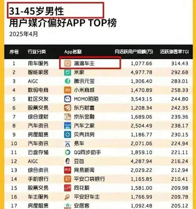 最近,有机构发布了31岁-45岁的中年男人偏好的APP 排行榜。